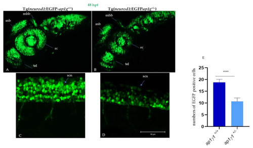 Neuronal characterization of ap1g1+/+ and ap1g1+/− embryos: Confocal images of ap1g1+/+ and ap1g1+/− embryos in transgenic background tg(neurod1:EGFP) 48 hpf. Lateral view of the central nervous system (A) and of spinal cord neurons (B) acquired using an LSM510 Meta confocal microscope (Zeiss (Oberkochen, Germany). (A,B) Images were acquired using a Plan-Neofluar 10X/0.3NA objective. A Z-stack was performed to acquire the whole central nervous system and Maximum Intensity Projection was obtained using Zen Black software. Abbreviations: mb, midbrain; hb, hindbrain; mhb, midbrain–hindbrain boundary; tel, telencephalon; rc, retinal cells; snc, spinal cord neurons. Single plane images were acquired using a PlanApochromat-63X/1.4 NA oil DIC objective. Size bar: 50 µm. (C,D) EGFP-positive cells were quantified by drawing polygonal regions on the image acquired and manually counting the number of cell somas in the selected area. The analysis is the result of 3 different experiments with n = 15 for each genotype. (E) Quantification of EGFP positive cells in the described spinal cord area described in figure C and D; **** p < 0.0001, Student’s t-test. |