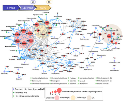 Filter I: Computational network analysis of the Hit targets identifies three functional groups and high recurrence, and refines candidates to 16 Hits Drug–Target list was constructed with known Drug–Target Interaction data extracted from DrugBank for the 59 candidate Hits. Subsequently, gene network of the 89 targets and interactions of the corresponding proteins were obtained from the STRING database (non‐interacting protein are removed here). Diamond‐shaped nodes correspond to drugs compounds as annotated in the DrugBank database and red nodes correspond to their targets (gene names presented here). Isolated diamonds (in light green) correspond to the 15 drugs with unknown targets. Edges corresponding to Target–Target interactions from STRING are indicated as solid gray lines, and Drug–Target interactions from DrugBank in blue lines. Recurrence analysis pinpoints a clustering of Hits into three functional groups with high recurrence, as depicted with ellipses: Adrenergic (light pink), Cholinergic (light yellow), CA (light brown). Target node size is scaled according to the number of drugs targeting the node and reflects recurrence. Recurrence of > 3 refines favorite drugs to 16 Hits (dark green diamond), represented in the three functional groups. |