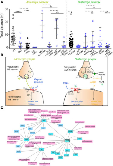 Specificity of the Hits for on‐target effects at the NMJid='emmm202216267-li-0028'> Box plots representing the effect of adrenergic (left, Oxymet., Oxymetazoline Hydrochloride; Xylomet., Xylometazoline Hydrochloride) and cholinergic (right, Acecl., Aceclidine Hydrochloride; Tropi., Tropicamide) Hits, in the presence of pathway‐specific blockers (Alfu., Alfuzosin, Curare) added as pretreatment. Each dot represents individual values for non‐injected WT embryos, MO‐injected larvae and MO‐injected larvae treated with the Hits ± blockers. In the absence of normality of distribution of the data, a nonparametric Kruskal–Wallis with Dunn's multiple comparison test is applied; means with ± standard deviation are represented; Proposed mechanisms of action of the adrenergic (left) and cholinergic (right) Hits on associated synapses. G‐coupled receptors are represented at the pre‐ or postsynaptic membrane according to their localization. Hits whose locomotion rescue action is expected to be dependent on direct action on receptors are shown in blue. Conversely, Hit whose action is assumed to be independent of its role as an agonist is shown in orange. NE, Norepinephrin; ACh, Acetylcholine; AChE, Acetylcholine‐esterase. Interaction's network between GAN and human diseases. Gigaxonin's substrates (dark blue) and associated diseases (light pink) were manually added to the initial list. The gene‐disease‐associated interactions with (KRT15, VIM, DES) are not displayed because too numerous, but they seem principally associated with cancer. The network of diseases closest to GAN mainly includes NMD. We distinguish several groups of neuromuscular pathologies, including numerous CMT forms, motor neuron pathology (ALS) and myopathies. |