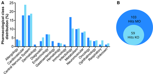 Pharmacological class of the Hits A, B. Bar plot (A) showing the distribution of the therapeutic classes (%) of the 59 Hits common to the gan morphants and the gan KO line (B), according to the Prestwick Chemical Library annotations. |