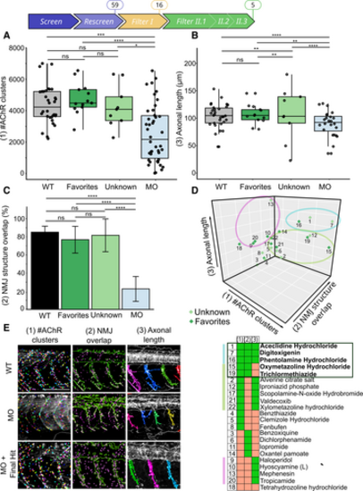Filter II: The automated imaging-analysis identifies five Hits regulating NMJ development in the gan zebrafish A–C. Boxplots showing individual and mean values of the number of postsynaptic AChR clusters (A) and axonal length (B) and bar plot showing NMJ structure overlap (C) for four groups: noninjected WT (black), MO-injected embryos (blue), MO-injected embryos treated with Favorites Hits (dark green) or Unknown Hits (light green). The central bands of the boxplots represent the median, the boxes of the boxplots represent the interquartile range (between the first and third quartile), and the whiskers represent the minimum and maximum values. D. 3-D scatter plot representing the z-scoring analysis for the three parameters (x (1) = #AChR clusters, y (2) = NMJ structure overlap, z (3) = Axonal length). The 3-D representation and the associated Hit-map identify subgroups of compounds with different penetrance of recovery of cellular deficits in the gan zebrafish, among which three Hits restore all parameters and two additional restore two parameters including NMJ common to all Hits. E. Representative images of the three parameters examined for noninjected WT embryos (WT), gan MO-injected embryos (MO), and gan MO-injected embryos treated with Aceclidine Hydrochloride, which restore all three parameters. Data information: Scale bar represents a length of 200 μm. Data information: Each dot represents individual values for WT and MO, and mean values of quadruplicate treated larvae with single Hits (Favorites, Unknown) (A–C). In the absence of normality of distribution of the data, a nonparametric Kruskal–Wallis test is applied; medians with range are represented; n = 34 (WT), n = 44 (MO), n = 13 (Favorites), n = 9 (Unknown); *P ≤ 0.05; **P ≤ 0.01, ***P ≤ 0.001, and ****P ≤ 0.0001. |