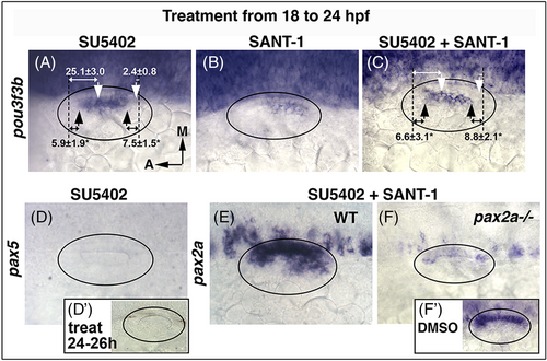 Disruption of Fgf and Hh after 18 hpf. (A-F) Inhibitors listed at the top were added at 18 hpf and expression of the indicated genes was examined at 24 hpf, except (D') in which SU5402 was added at 24 hpf and pax5 expression was examined at 26 hpf. Oval marquee denotes outer edge of the otic vesicle. White arrows (A, C) mark the normal boundaries of pou3f3b expression, black arrows mark altered boundaries in treated embryos. Black dashed lines mark positions of the anterior and posterior boundaries of the lumen, and distances in μm (mean ± SD) from the edges of the pou3f3b domain are indicated. Asterisks indicate statistically significant differences relative to the control. |