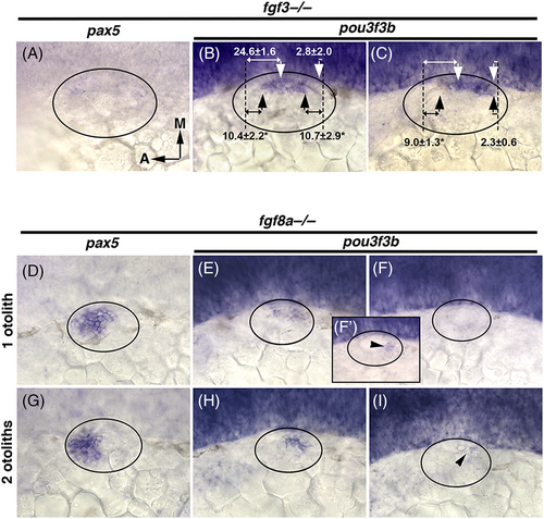 Effects of disrupting fgf3 or fgf8a. (A-I) Dorsolateral views showing expression of pax5 and pou3f3b at 24 hpf in fgf3−/− and fgf8a−/− mutants, as indicated at the top. White arrows (B, C) mark boundaries of pou3f3b normally seen in wild-type embryos, black arrows mark altered boundaries observed in fgf3−/− mutants, and dashed lines mark positions of the anterior and posterior boundaries of the lumen. Distances in μm separating the edges of the pou3f3b domain from that anterior and posterior poles are indicated. Asterisks indicate significant differences from the control. (D-I) fgf8a−/− mutants with one or two otoliths per ear, as indicated on the side, were analyzed separately. |