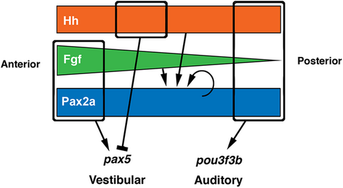 Model of differential regulation of pax5 and pou3f3b. Colored regions represent distributions of upstream factors necessary for regulating pax5 and pou3f3b in the utricular and saccular maculae, respectively. Hh and Pax2a are expressed uniformly along the AP axis, while Fgf is expressed in a gradient. Rounded rectangular marquees indicate combinations of factors required to activate (arrows) or repress (bar) expression. Expression of pax2a is maintained by partially redundant activities of Hh, Fgf, and Pax2a itself. |