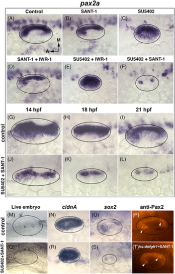 Critical roles for Fgf and Hh in regulating pax2a and sensory development. (A-T) Dorsolateral views of the otic placode or vesicle at various stages. (A-F) Images showing pax2a expression at 24 hpf following treatment at 12 hpf with inhibitors for Hh, Wnt, and Fgf (listed at top). IWR-1 (10 μM) was used to block Wnt. (G-L) Time course of pax2a expression in wild-type (DMSO treated) or SU5402 + SANT-1 treated embryos. Drugs were administered at 12 hpf and embryos were fixed at the timepoints listed at top. (M, Q) Images of live embryos at 24 hpf following treatment with DMSO (control) or SU5402 + SANT-1. (N, R) Expression of cldnA at 24 hpf in control and drug treated embryos. (O, S) Expression of sox2 at 24 hpf in control and drug treated embryos. (P, T) Anti-Pax2 staining at 30 hpf after blocking Fgf and Hh. Here Fgf was blocked by activating hs:dnfgfr1 to avoid intense background fluorescence caused by SU5402. Embryos were heat shocked at 12 hpf for 1 h at 39°C followed by immediate addition of SANT-1 (150 μM). Arrowheads mark elevated staining in tether cell nuclei. |