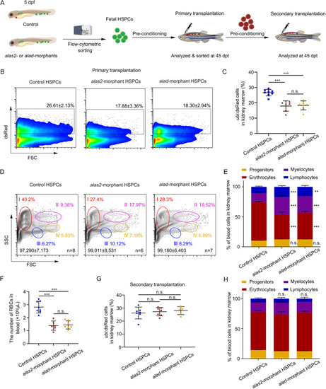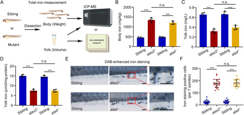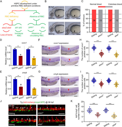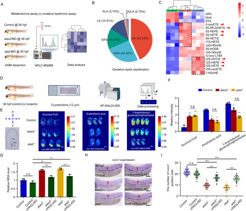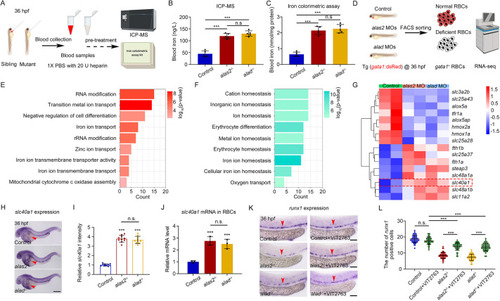 Iron-dependent HSPC ferroptosis in alas2−/− and alad−/−. (A) Transmission electron microscopy (TEM) view of a longitudinal section through the artery and vein in control, alas2−/− and alad−/− AGM region at 36 hpf. (B) TEM view of HSPC subcellular structures. From top to bottom panels are mitochondria and membrane. Arrowheads in black denote mitochondria, green denote plasma membrane and blue denote double-membrane vesicle. (C-E) Quantification of mitochondria area, mitochondria cristae area and cristae number in HSPCs of control, alas2−/− and alad−/−. Box plots show median values (middle bars) and first to third interquartile ranges (boxes); whiskers indicate 1.5 times the interquartile ranges (IQR); individual points from the 10 to 90 percentile are plotted and shown. n (mitochondria)=96. (F) Quantification of membrane-disrupted HSPCs in control, alas2−/− and alad−/−. n (HSPCs)=12. (G,H) Western-blotting detection of the protein level of Fth1, Gpx4 and Slc7a11 in flow cytometric-sorted HSPCs of control, alas2−/− and alad−/− at 36 hpf, respectively (30,000 HSPCs were sorted in each group). (I) Quantification of protein levels in H. Protein levels were analyzed using 8-bit-gray analysis (Gel-Pro analyzer). n=3 experimental replicates. (J) Schematic workflow for the ferrous iron assessment in HSPCs (cmyb+) of alas2−/− and alad−/− with fluorescent iron probes (Fe2+ biotracker dye, FeRhoNox-1 and FerroOrange) at 36 hpf. (K) Representative flow cytometric histogram of the Fe2+ level in sorted HSPCs of control, alas2−/− and alad−/− at 36 hpf measured by Fe2+ biotracker dye. (L) Quantification of mean fluorescence intensity (MFI) of labile Fe2+ level in K. (M) Representative fluorescence images show the co-localization of cmyb:GFP+ and FeRhoNox-1+ cells in alas2−/− and alad−/− at 36 hpf. The cmyb+/FeRhoNox-1+ cells are denoted by white arrowheads. (N) Flow cytometric analysis of the percentage of cmyb+/FeRhoNox-1+ cells in control, alas2−/− and alad−/− at 36 hpf. (O) Statistical analysis of the percentage of FeRhoNox-1+ HSPCs in N. n=3 experimental replicates. (P) Quantification of MFI of Fe2+ level in N. n=3 experimental replicates. (Q) Expression of HSPC marker runx1 in control, alas2−/− and alad−/− with or without DFO treatment (100 μM) at 36 hpf examined by WISH. The AGM regions for marker gene-positive cell counting are denoted by red arrowheads. (R) Quantification of the runx1-positive HSPCs in Q. n=3 experimental replicates. (S) Confocal imaging shows the kdrl+/cmyb+ HSPCs in control, alas2−/− and alad−/− with or without DFO treatment at 36 hpf. (T) Quantification of the HSPCs in S. n=3 experimental replicates. (U) Expression of HSPC marker runx1 in control, alas2−/− and alad−/− with or without Ferrostatin-1 (Fer-1) treatment (10 μM) at 36 hpf examined by WISH. The AGM regions for marker gene-positive cell counting are denoted by red arrowheads. (V) Quantification of the runx1-positive HSPCs in U. n=3 experimental replicates. (W) Confocal imaging shows the kdrl+/cmyb+ HSPCs in control, alas2−/− and alad−/− with or without Fer-1 treatment at 36 hpf. (X) Quantification of the HSPCs in W. n=3 experimental replicates. Number of samples are indicated. Data are mean±s.d. *P<0.05, **P<0.01, ***P<0.001 [one-way ANOVA, Tukey's multiple comparisons (C-F,L,O,P,R,T,V,X); two-way ANOVA, Sidak's multiple comparisons (I)]. n.s., not significant. Scale bars: 10 μm (A); 0.5 μm (B); 50 μm (M); 100 μm (Q,S,U,W).