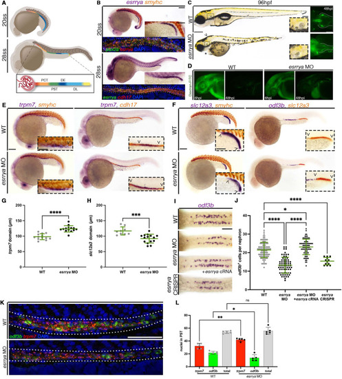 esrrγa is essential for nephrogenesis. (A) Zebrafish nephron development from 20-28 ss. Nephrons possess proximal convoluted tubule (PCT), proximal straight tubule (PST), distal early (DE) and distal late (DL) segments. (B) WISH and FISH reveal that esrrγa transcripts colocalize with renal progenitor marker pax2a at 20 ss. Somites marked with smyhc (red). At 28 ss, esrrγa colocalizes with tubule marker cdh17. (C) esrrγa morphants display pericardial edema (asterisk), smaller eyes and altered head morphology (arrowhead) and fused otoliths (inset) (left). Dextran-FITC in the PCT at 48 hpi, white dotted line outlines nephron (right). (D) WT and esrrγa SB morphant at 6 hpi and 48 hpi after dextran-FITC. (E,F) WISH for PST marker trpm7 (E) and DL marker slc12a3 (F) with somite marker smyhc or nephron marker cdh17. (G,H) Length of PST (G) and DL (H) at 28 ss, each dot represents a single animal. (I) WISH for MCC marker odf3b at 24 hpf. (J) MCCs per nephron; each dot represents one nephron. Two nephrons were counted per animal. (K) FISH for MCCs (odf3b, green and dashed ovals), PST cells (trpm7, red) and DNA (DAPI, blue) at 24 hpf. (L) Absolute cell number of odf3b- and trpm7-expressing cells at 24 hpf. Each dot represents a single animal. Data are mean±s.d. *P<0.05, **P<0.01, ***P<0.001, ****P<0.0001 (unpaired t-test or one-way ANOVA). ns, not significant. Scale bars: 100 µm (B-F); 50 µm (B,C,E,F insets, I,K). |