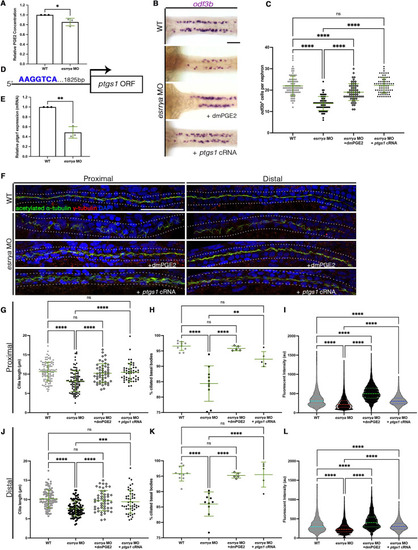 esrrγa controls ciliogenesis through regulation of prostaglandin signaling. (A) Relative PGE2 concentration. (B) WISH for MCCs (odf3b) at 28 ss. (C) MCCs per nephron. Each dot represents one nephron. Two nephrons were counted per animal. (D) Schematic of a putative Esrrγa binding site upstream of the ptgs1 open reading frame (ORF). (E) ptgs1 quantified via qRT-PCR. (F) IF for indicated markers at 28 hpf. Dotted lines indicate nephron tubule. (G,J) Cilia length in proximal (G) and distal (J) pronephros. Each dot represents one cilium. Ten cilia were measured per animal. (H,K) Percentage of ciliated basal bodies in proximal (H) and distal (K) pronephros. Each dot represents a single animal. (I,L) Fluorescent intensity plots (cilia, α-tubulin) for the same relative distance in proximal (I) and distal (L) pronephros. Each dot represents the fluorescent intensity of an animal at a given point across the segment of interest. (G-L) WT n=10, esrrγa MO n=10, esrrγa MO with dmPGE2n=5, esrrγa MO with ptgs1 cRNA n=5. Data are mean±s.d. *P<0.05, **P<0.01, ***P<0.001, ****P<0.0001 (unpaired t-test or one-way ANOVA). ns, not significant. Scale bars: 50 µm. |