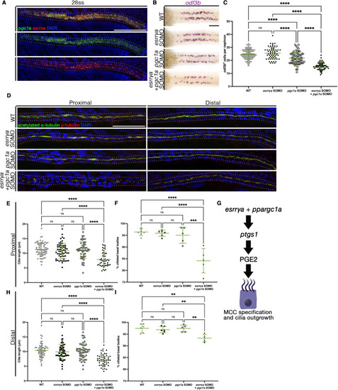 Genetic interaction of esrrγa and pgc1a drives MCC specification and ciliogenesis. (A) FISH reveals that esrrγa colocalizes with pgc1a in 24 hpf WT zebrafish. (B) MCCs stained via WISH (odf3b). (C) MCCs per nephron. Each dot represents one nephron. Two nephrons were measured per animal. (D) IF for indicated markers at 28 hpf. Dotted lines indicate nephron tubule. (E,H) Cilia length in proximal (E) and distal (H) pronephros. Each dot represents one cilium. Ten cilia were measured per animal. WT n=6, esrrγa SOMO n=6, pgc1a SOMO n=5, esrrγa and pgc1a SOMO n=5. (F,I) Percentage of ciliated basal bodies in proximal (F) and distal (I) pronephros. Each dot represents an individual. (G) esrrγa and pgc1a cooperate upstream of ptgs1 and PGE2 production to regulate MCC cell fate and ciliogenesis. Data are mean±s.d. **P<0.01, ****P<0.0001 (one-way ANOVA). ns, not significant. Scale bars: 50 µm. |