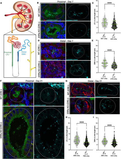 Murine ERRγ functions in ciliary development. (A) Schematic of mammalian kidney and nephron. Proximal segments are LTL+ and distal segments are DBA+. (B,D) IF for α-tubulin in LTL+ (B) and DBA+ (D) tubules (dotted outline) in 7-day-old animals. (C,E) Cilia length in LTL+ (C) and DBA+ (E) 7-day old animals. Number of animals given as n and number of cilia measured. (F,G) IF for α-tubulin in LTL+ (F) and DBA+ (G) tubule (dotted outlines) in 21-day-old animals. (H,I) Cilia length in LTL+ (H) and DBA+ (I) 21-day old animals. Number of animals given as n and the number of cilia measured. Data are mean±s.d. ****P<0.0001 (unpaired t-test). Scale bars: 25 µm. |