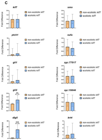 RT-qPCR of 6wpf zebrafish (D. rerio). Comparisons between wild-type and scoliotic kif7co63/co63 (A), wild-type and non-scoliotic kif7co63/co63 (B), and scoliotic kif7co63/co63 and non-scoliotic kif7co63/co63 (C) was performed for genes in the shh signaling pathway and the keratin genes observed in the RNA sequencing data. Error bars represent 95% confidence intervals. * indicates p < 0.05, ** indicates p < 0.01, and *** indicates p < 0.001. |
