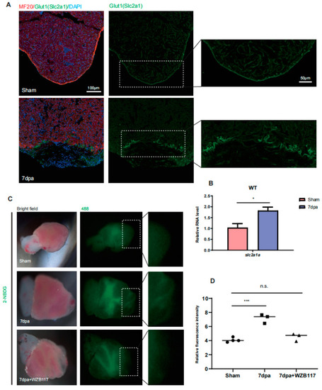 Glut1 expression and glucose uptake are upregulated around injury area of zebrafish hearts. ( |