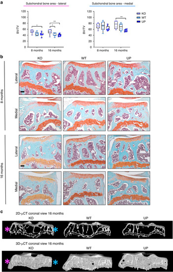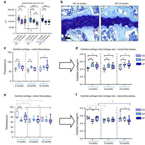 Histomorphometry of the cartilage was performed with QuPath at 4, 8, and 16 months. Knee joints of male mice were stained with Toluidine blue and areas corresponding to the total cartilage, the calcified cartilage, and the growth plate were measured for the medial tibial plateau and the lateral tibial plateau. |