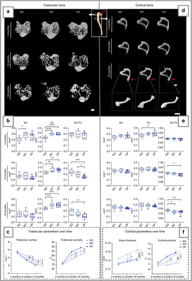 µCT analysis of the metaphysis of the tibia of the male mice at 4, 8 and 16 months. The trabecular bone (left) and the cortical bone (right) were analyzed separately. Regions measured for the trabecular bone and cortical bone are illustrated on the schematic tibia with the growth plate (GP), marked with a red dotted line, used as a reference for their selection. |