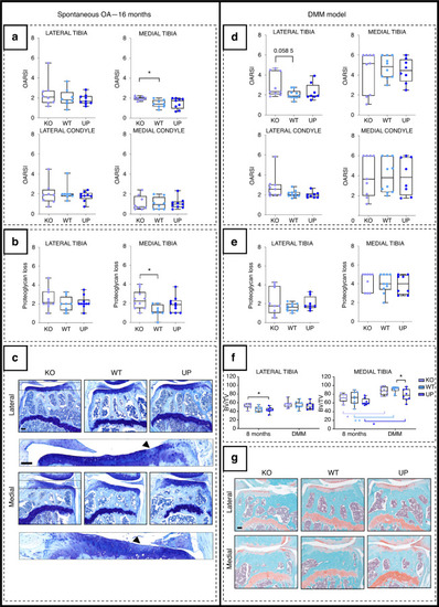 Analysis of the development of OA lesions in the different genotypes after spontaneously occurring with age (left) or after the DMM (right). The spontaneous OA lesions were considered in the 16-month-old male mice and the DMM was performed on 16-week-old male mice and they were stopped at 28 weeks. |