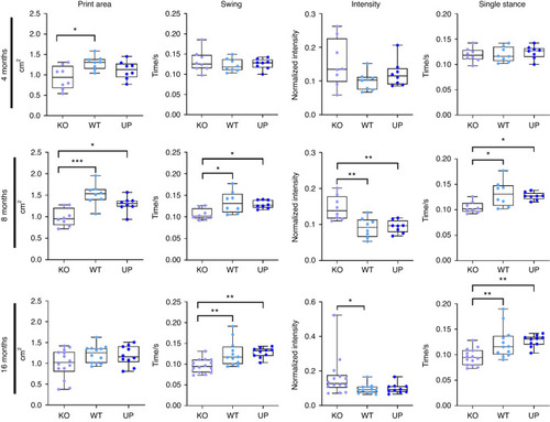 Analysis of the gait of 4-, 8-, and 16-month-old male mice with the CatWalk XT. The intensity corresponds to the mean intensity at the maximum paw contact normalized with the mean of the maximum contact paw area, the speed, and the weight of the mouse. At 4 months: |
