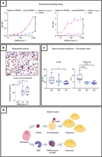 OMD inhibits osteoclastogenesis through its direct interaction with RANKL and balances bone remodeling. |