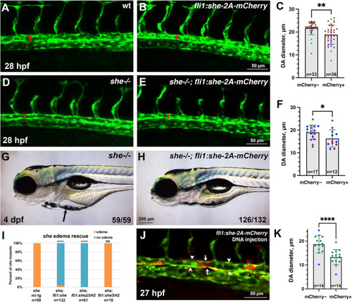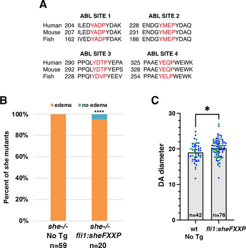 Consensus ABL phosphorylation sites YXXP are required for SHE function. (A) Consensus ABL phosphorylation sites are conserved between zebrafish, mice and humans. (B) Vascular endothelial expression of a mutant construct |
