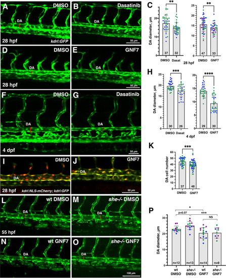 Inhibitors of Abl signaling reduce DA diameter in wild-type and (A-E) Dorsal aorta diameter at 28 hpf is reduced in |