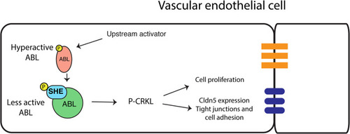 A proposed model for SHE and ABL signaling during vascular tubulogenesis. Activated ABL promotes enlarged vascular lumen through a downstream effector P-CRKL which increases endothelial cell proliferation and increases Cldn5 expression, thus affecting tight junctions and cell adhesion. Activated ABL phosphorylates SHE, which then interacts with ABL to dampen its activity resulting in the lumen of appropriate size. |