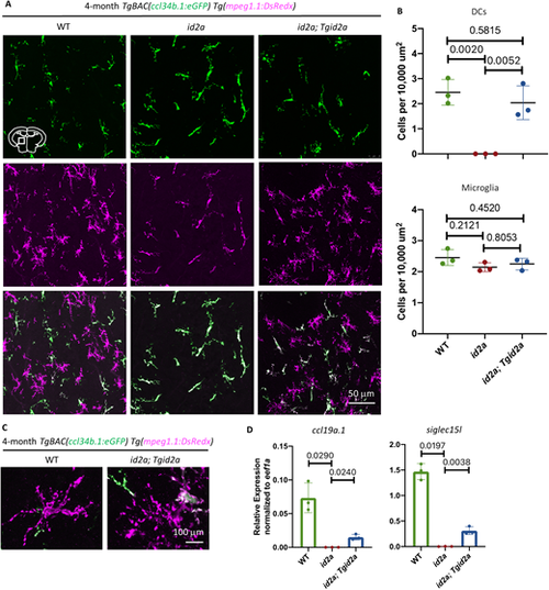 id2a is cell-autonomously required for the development of brain-associated DCs. (A,B) Representative images (A) and quantification (B) of the ccl34b.1−mpeg1.1+ cells (upper panel) and ccl34b.1+mpeg1.1+ (lower panel) cells in the transverse midbrain sections of 4-month-old TgBAC(ccl34b.1:eGFP);Tg(mpeg1.1:DsRedx) WT fish, id2a mutants or Tg(mpeg1.1:id2a);id2a (id2a; Tgid2a) transgenic mutants. The location of the imaging area is indicated by the box in the midbrain diagram. The ccl34b.1+ cells are GFP+DsRedx+ double positive, whereas ccl34b.1− cells are DsRedx+ single positive. n=3 for each group. (C) Representative images of ccl34b.1−mpeg1.1+ cells in the transverse brain sections of 4-month-old TgBAC(ccl34b.1:eGFP);Tg(mpeg1.1:DsRedx) WT fish, id2a mutants or id2a; Tgid2a transgenic mutants. (D) RT-PCR shows the expression levels of DC marker genes (ccl19a.1 and siglec15l) in ccl34b.1−mpeg1.1+ DCs sorted from the brains of 3-month-old TgBAC(ccl34b.1:eGFP);Tg(mpeg1.1:DsRedx) WT fish, id2a mutants or id2a; Tgid2a transgenic mutants. n=3 for each group. Data are mean±s.d. Unpaired Student's t-test with Welch's correction. |