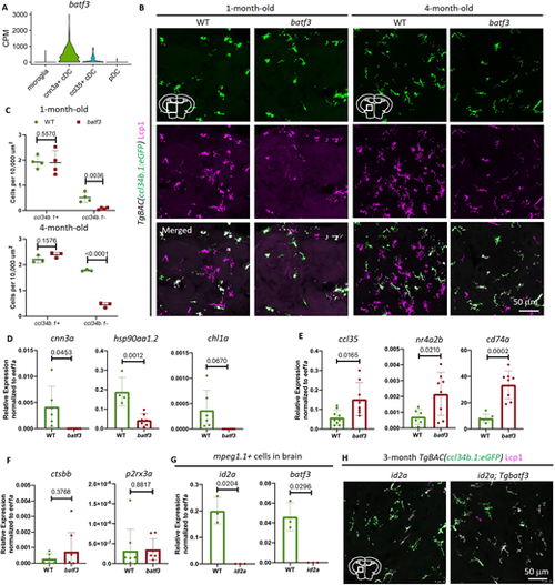 batf3 is downstream of id2a and required for cnn3a+ DC subset development. (A) Normalized expression of batf3 in cnn3a+ cDCs, ccl35+ cDCs and pDCs from the scRNA-seq dataset. (B,C) Representative images (B) and quantification (C) of the density of the ccl34b.1+ (GFP+Lcp1+) and ccl34b.1− (GFP−Lcp1+) cells in the transverse midbrain sections of 1-month-old and 4-month-old TgBAC(ccl34b.1:eGFP) WT or batf3 mutant fish. The total myeloid cells in the brain were visualized using anti-Lcp1 staining, which labels both microglia and brain-associated DCs in a WT background. n≥3 for each genotype. (D-F) RT-PCR shows the expression levels of cnn3a+ DC-specific markers (cnn3a, hsp90aa1.2 and chl1a) (D), ccl35+ DC-specific markers (ccl35, nr4a2b and cd74a) (E) and pDC-specific markers (ctsbb and p2rx3a) (F) in ccl34b.1−mpeg1.1+ cells sorted from the brains of 4-month-old TgBAC(ccl34b.1:eGFP);Tg(mpeg1.1:DsRedx) WT or batf3 mutant fish. n≥6 for each group. (G) RT-PCR shows the expression levels of id2a (left) and batf3 (right) in the mpeg1.1+ cells sorted from the brains of 5-month-old Tg(mpeg1.1:DsRedx) WT or id2a mutant fish. n=3 for each genotype. (H) Midbrain transverse sections of 4-month-old TgBAC(ccl34b.1:eGFP);id2a or Tg(mpeg1.1:batf3);id2a (id2a; Tgbatf3) transgenic mutants. The location of imaging is indicated by the box in the midbrain diagram. The microglia are marked by GFP+ and brain-associated DCs are Red+ single positive cells visualized by anti-Lcp1 staining, which labels both microglia and brain-associated DCs in a WT background. Data are mean±s.d. Unpaired Student's t-test with Welch's correction. |