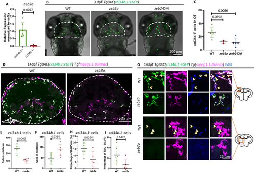 zeb2a promotes the proliferation of microglia. (A) RT-PCR showing the expression levels of zeb2a in the ccl34b.1+ (GFP+DsRedx+) and ccl34b.1− (GFP−DsRedx+) cells sorted from the brains of 4-month-old TgBAC(ccl34b.1:eGFP);Tg(mpeg1.1:DsRedx) fish. n=7 for each group. (B,C) Representative images (B) and quantification (C) of ccl34b.1+ cells in the optic tectum of 3 dpf TgBAC(ccl34b.1:eGFP) WT embryos, zeb2a single mutants and zeb2a/b double mutants (zeb2-DM). The optic tectum is indicated by dashed lines. n≥3 for each genotype. (D-F) Representative images (D) and quantification of ccl34b.1+mpeg1.1+ (GFP+DsRedx+) (E) and ccl34b.1−mpeg1.1+ (GFP−DsRedx+) (F) cells in the transverse midbrain sections of 14 dpf TgBAC(ccl34b.1:eGFP);Tg(mpeg1.1:DsRedx) WT or zeb2a mutant fish. The brain region is indicated by the dashed line. n=5 and 6 for WT and zeb2a mutants, respectively. (G-I) Representative images (G) and quantification of EdU+ ccl34b.1+mpeg1.1+ (GFP+DsRedx+) (H) and EdU+ ccl34b.1−mpeg1.1+ (GFP−DsRedx+) (I) cells in the transverse midbrain sections of 13 dpf TgBAC(ccl34b.1:eGFP);Tg(mpeg1.1:DsRedx) WT or zeb2a mutant fish. n=6 and 5 for WT and zeb2a mutants, respectively. Data are mean±s.d. Unpaired Student's t-test with Welch's correction. |