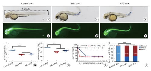 Body length, body axis and survival rate of best1 zebrafish morphants. (A–F) Gross morphology of transgenic (HuC:EGFP) zebrafish embryos at 2-dpf. Compared with control morpholino (MO), knock down best1 causes shorter body length (C–F), curved body axis (C–F). (G) A time-course plot of percent survival in control versus best1 morphants for 3 days. (H) The percentage of embryos with development defects. (I, J) Quantification of body length (I) and curvature angles (J) of embryos. Columns, mean; standard error of the mean (n = 10; analysis of variance), ***p < 0.0001. Scale bar, 100 μm. dpf, days post fertilization. EXPRESSION / LABELING: