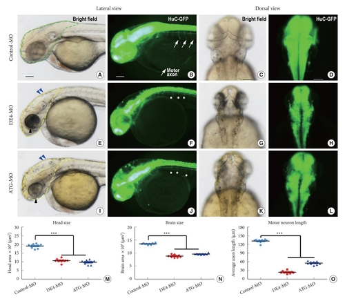 Nervous system developmental abnormalities caused by best1 knockdown. (A–L) Gross morphology of transgenic (HuC:EGFP) zebrafish embryos at 2-dpf. Compared with control morpholino (MO), knockdown of best1 gene causes head and brain patterning defects (E, I, blue arrowheads), microcephaly (E, I, yellow dotted line), small eyes (E, I, black arrowheads), brain-size reductions (F, J, H, and L), and abnormal neuronal outgrowth (F, J, asterisks). (M–O) Quantification of the head area (M), brain area (N) and average motor axon length (O) shows significantly decrease in best1 morphants. Columns, mean; standard error of the mean (n=10; analysis of variance), ***p < 0.0001. Scale bar, 100 μm. dpf, days post fertilization. |