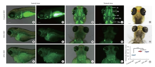 Loss of best1 causes abnormal craniofacial structure and interorbital distance. (A–N) Representative bright field and fluorescent images of zebrafish head skeleton at 6-dpf. In vivo visualization of the skeleton is achieved by the administration of a fluorescent dye (Calcein) directly to the fish water. Dyes that bind to calcified matrix can be used to label the entire skeleton. Lateral view (A–F) and ventral view (G–L) of the head skeleton of day-6 embryos labeled with Calcein. (B, C, E, F, H, I, K, and L) When embryos were injected with best1-morpholino (MO) at the one-cell stage, the amount of stained mineralized tissue was significantly reduced compared to fish injected with control-MO. Panel N show increased intraocular distance (yellow arrows) in best1 morphants. Panel M and N show measurements of the distance between the eyes, and panel O shows the distances depicted graphically as the mean for 10 embryos of each type. Columns, mean; standard error of the mean (n = 10; analysis of variance), ***p < 0.0001. Scale bar, 100 μm. 5ba, fifth branchial arch; op, opercular bone; ec, ectopterygoid; e, ethmoid plate; pq, palatoquadrate; m, Meckel cartilage; dpf, days postfertilization. PHENOTYPE:
