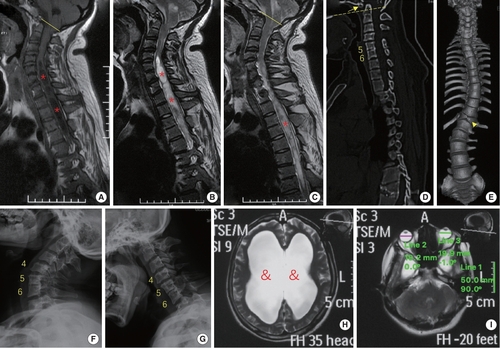 phenotypes of the patient with a premature stop codon of BEST1 gene (p.S79Ffs*153). (A–C) Sagittal magnetic resonance imaging (MRI) revealed Chiari malformation (cerebellar tonsil exceeding the foramen magnum, yellow line) and extensive syringomyelia (red stars) at cervical and thoracic segments. (D–G) Computed tomography and x-ray showed assimilation of atlas (arrow), basilar invagination (odontoid process above the chamberlian line, yellow dotted line), Klippel-Feil malformation (fusion of C5 and C6 vertebrae), butterfly vertebra at T12 (arrow head) and scoliosis. (H, I) MRI of the head indicated hydrocephalus (&) and microphthalmia (diameter of eyeball is smaller than 20 mm). |