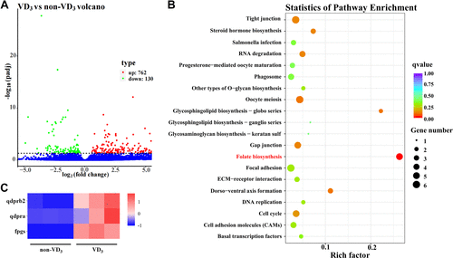 The folate pathway in zebrafish was influenced by dietary VD3. A: volcano plot of differentially expressed genes (DEGs) in the visceral mass of zebrafish-fed diets with VD3 or without VD3. Each dot represents an individual gene (n = 9 fish). The red dots (top) indicate the significantly upregulated genes (P < 0.05), whereas the green dots (bottom) represent the significantly downregulated genes (P < 0.05). B: the top 20 KEGG pathways enriched for DEGs. Rich factor is the ratio of the number of DEGs enriched in a certain pathway to the total number of DEGs (n = 9 fish). C: the heat-map of DEGs related to the folate biosynthesis (n = 9 fish). VD, vitamin D. |