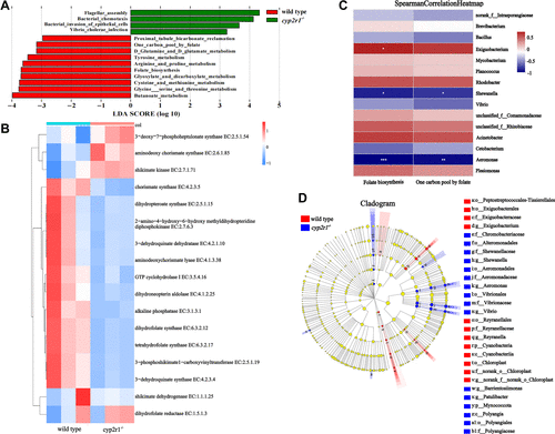 VD affected the functions related to the folate biosynthesis in gut commensals of zebrafish. A: the functional KEGG profiles of gut microbiota in wild-type and cyp2r1–/– zebrafish were predicted based on Tax4Fun analysis (LDA score > 2, P < 0.05). B: the heat-map was constructed to illustrate the differential abundance of the enzymes related to folate biosynthesis in wild-type and cyp2r1–/– zebrafish. The red and blue squares indicate the higher and lower abundance, respectively. C: the Spearman’s correlation between the predicted pathways of folate biosynthesis and the dominant genus in the gut microbiota was displayed. *P < 0.05; **P < 0.01; ***P < 0.001. D: the cladogram showing differentially abundant taxa in the gut microbiota of wild-type and cyp2r1–/– zebrafish. The enriched taxa in the wild-type (red) and cyp2r1–/– (blue) zebrafish were indicated. VD, vitamin D. |