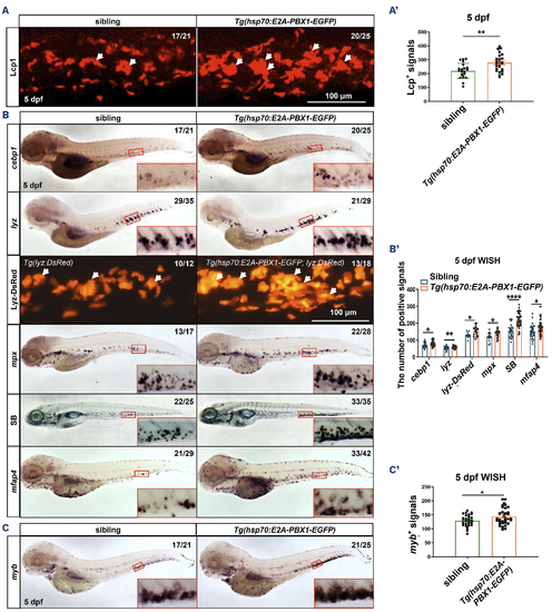 Induction of hE2A-PBX1 expression in zebrafish larvae leads to myeloid cell and hematopoietic stem cell expansion. (A) Immunofluorescence staining of Lcp1+ cells in siblings (left panel) and Tg(hsp70:E2A-PBX1-EGFP) (right panel) at 5 days post-fertilization (dpf). (A’) Statistical analysis of the Lcp1+ signals in panel (A). The black asterisks indicate statistical difference (Student t tests, mean ± standard error of the mean [SEM]; **P<0.01) (B) Whole mount in situ hybridization (WISH) of cebp1, lyz, mpx and mfap4 expressions in Tg(hsp70:E2A-PBX1-EGFP) (right panel) were higher than siblings (left panel) at 5 dpf. The number of lyzDsRed+ cells (caudal hematopoietic tissue [CHT] region and Sudan Black B-positive [SB+] cells in Tg(hsp70:E2A-PBX1-EGFP) (right) was higher than siblings (left) at 5 dpf. The CHT is enlarged in the red box (original magnification ×200). (B’) Statistical analysis of the positive signals (cebp1, lyz, lyz-DsRed, mpx, SB and mfap4) in panel (B). The black asterisks indicate statistical difference (Student t tests, mean ± SEM; *P<0.05, **P<0.01, ****P<0.0001) (C) WISH of myb expressions in Tg(hsp70:E2A-PBX1-EGFP) (right panel) were higher than siblings (left panel) at 5 dpf. (C’) Statistical analysis of the myb+ signals in panel (C). The black asterisks indicate statistical difference (Student t tests, mean ± SEM; *P<0.05). N/N: number of zebrafish larvae showing representative phenotype/total number of zebrafish larvae examined. |