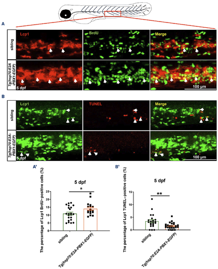 Abnormal myeloid cell expansion in Tg(hsp70:E2A-PBX1-EGFP) fish caused by proliferation and apoptosis perturbation. (A) Immunofluorescence double staining of Lcp1 and bromodeoxyuridine (BrdU) antibodies reveals a significant increase in myeloid cell proliferation in the caudal hematopoietic tissue (CHT) region of 5 days post-fertilization (dpf) Tg(hsp70:E2A-PBX1-EGFP) larvae (N=22) compared with the siblings (N=17). Lcp1/BrdU double-positive cells are indicated by white arrows. (A’) Statistical analysis of percentage of Lcp1+ BrdU+ cells in panel (A). The black asterisks indicate statistical difference (Student t tests, mean ± standard error of the mean; *P<0.05). (B) Co-staining of Lcp1 and transferase dUTP nick end labeling (TUNEL) was used to detect the apoptosis in the CHT region of 5 dpf Tg(hsp70:E2A-PBX1-EGFP) larvae (N=22) compared with the siblings (N=24). Lcp1/TUNEL double-positive cells are indicated by white arrows. (B’) Statistical analysis of percentage of Lcp1+ TUNEL+ cells in panel (B). The black asterisks indicate statistical difference (Student t tests, mean ± standard error of the mean; **P<0.01). |