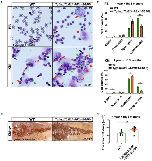 Tg(hsp70:E2A-PBX1-EGFP) adult fish exhibit abnormal myeloid cell expansion which resembles acute myeloid leukemia-like phenotypes. (A) May-Grunwald-Giemsa staining of peripheral blood (PB) cells (upper panels) and kidney marrow (KM) blood cells (lower panels) in 1-year-old wild-type (WT) (left panel) and Tg(hsp70:E2A-PBX1-EGFP) (right panel) adult fish after 3-month heat shock. Red arrows indicate myelocytes, black arrows indicate lymphocytes and green arrows indicate blasts. Original magnification ×400. Blood cell counts of PB and KM were calculated manually based on their morphology. (A’) Statistical analysis of cell counts in panel (A). The black asterisks indicate statistical difference (N=9, one-way ANOVA, mean ± standard error of the mean; *P<0.05, **P<0.01). (B) Kidneys from 1-year-old transgenic fish were enlarged to 1.36-fold in area compared with siblings after 3-month heat shock. (B’) Statistical analysis of the area of kidney in panel (B). The black asterisks indicate statistical difference (N=9, Student t tests, mean ± standard error of the mean; **P<0.01). |