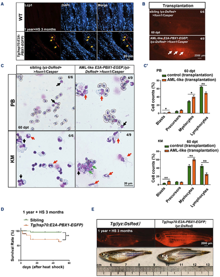 Generation and characterization of transgenic zebrafish expressing human E2A-PBX1 (hE2A-PBX1). (A) Schematic representation of Tg(hsp70:E2A-PBX1-EGFP) expression vector, and Sanger sequencing confirmed the presence of the hE2A-PBX1 sequence. FP: forward primer; pA: poly A termination sequence. (B) F4 generation hE2A-PBX1-transgenic embryos exhibited EGFP expression at 32 hours post-fertilization (hpf). EGFP- (sibling) and EGFP+ (Tg(hsp70:E2A-PBX1-EGFP)) embryos obtained by crossing the stable line Tg(hsp70:E2A-PBX1-EGFP) with wild-type (WT) fish. Tg(hsp70:E2A-PBX1-EGFP) embryos exhibited strong EGFP fluorescence (white arrows). (C) Specific polymerase chain reaction (PCR) amplification of a 231 bp fragment within the hE2A-PBX1 fusion region confirmed the integration of hE2A-PBX1 cDNA sequence into the genomes of Tg(hsp70:E2A-PBX1-EGFP). (D) Real time quantitative PCR (RT-qPCR) analysis showed hE2A-PBX1 mRNA high expression in Tg(hsp70:E2A-PBX1-EGFP) compared to the siblings at 3 days post-fertilization (dpf). The black asterisks indicate statistical difference (Student t tests, mean ± standard error of the mean; ****P<0.0001) (E) Wright-Giemsa staining of whole blood cells from siblings and Tg(hsp70:E2A-PBX1-EGFP) at 5 dpf. Myelocytes are indicated by red arrows in the image. (E’) Statistical analysis of the cell counts in panel (E). The black asterisks indicate statistical difference (one-way ANOVA, mean ± standard error of the mean; *P<0.05). N>150, number of zebrafish larvae. (F) Survival curves of Tg(hsp70:E2A-PBX1-EGFP) and sibling larvae up to 15 days after heat shock. The black asterisks indicate statistical difference (log-rank [Mantel-Cox] test; ****P<0.0001). |