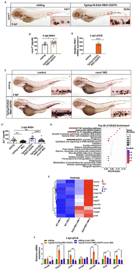 hE2A-PBX1 activate the TNF/IL-17/MAPK signaling pathway through upregulation of runx1 expression. (A) Whole mount in situ hybridization (WISH) of runx1 expressions in Tg(hsp70:E2A-PBX1-EGFP) (right panel) were higher than siblings (left panel) at 5 days post-fertilization (dpf). The caudal hematopoietic tissue (CHT) is enlarged in the red box (original magnification ×200). (A’) Statistical analysis of the runx1+ signals in panel (A). The black asterisks indicate statistical difference (Student t tests, mean ± standard error of the mean [SEM]; *P<0.05). N/N: number of zebrafish larvae showing representative phenotype/total number of zebrafish larvae examined. (B) Real time quantitative polymerase chain reaction (RT-qPCR) analysis showed increased runx1 mRNA expression in Tg(hsp70:E2A-PBX1-EGFP) compared to the sibling controls at 3 dpf. The black asterisks indicate statistical difference (Student t tests, mean ± SEM; ****P<0.0001) (C) Decreased number of lyz+ neutrophils in sibling and Tg(hsp70:E2APBX1-EGFP) larvae after injecting 0.2 mM runx1 morpholino (MO) at 3 dpf. The control groups were treated with 0.2 mM random sequence MO. The CHT is enlarged in the red box (original magnification ×200). (C’) Statistical analysis of the lyz+ signals shown in panel (C). The black asterisks indicate statistical difference (N≥15, one-way ANOVA, mean ± SEM; ***P<0.001, ****P<0.0001). (D) Top 20 enriched KEGG pathways identified in the analysis of differentially expressed genes (DEG) in KM cells from 6-month-old Tg(hsp70:E2A-PBX1-EGFP) compared to control groups after 3-month heat shock. The TNF/IL-17/MAPK signaling pathway is highlighted by the red arrow. (E) Heatmap of DEG involved in the TNF/IL-17/MAPK signaling pathway between WT and hE2A-PBX1 adult fish. Red and blue represent an increase and decrease gene expression levels, respectively; P<0.05. (F) RT-qPCR analysis showing mRNA expression of fosab, hsp27, junb, mmp9, socs3b, fosb and fosl1a in Tg(hsp70:E2A-PBX1-EGFP) compared to siblings after injecting 0.2 mM runx1 MO at 3 dpf. The control groups were treated with 0.2 mM random sequence MO (one-way ANOVA, mean ± SEM; *P<0.05, **P<0.01, ***P<0.001). TNF: tumor necrosis factor; IL-17: interleukin-17; MAPK: mitogen-activated protein kinase. |