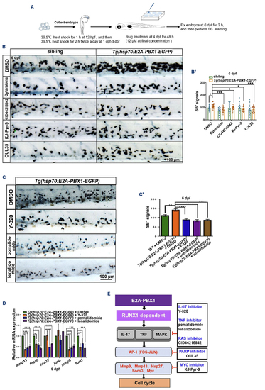 KJ-Pyr-9, OUL35, and CID44216842 effectively alleviate hE2A-PBX1-induced myeloid expansion in zebrafish larvae. (A) Flowchart illustrating the high-throughput drug screening process conducted in this study. Briefly, embryos were collected and subjected to a 1-hour heat shock at 12 hours post-fertilization (hpf), followed by twice daily 2-hour heat shocks from 1 to 3 days post-fertilization (dpf). Subsequently, zebrafish larvae were soaked in a solution containing small molecule compounds (initial screening concentration was 12 μM), the number of neutrophils was quantified using Sudan Black B (SB) staining at 6 dpf. (B) SB staining of sibling (left panel) and Tg(hsp70:E2A-PBX1-EGFP) (right panel) larvae after treatment with dimethyl sulfoxide (DMSO), 6.17 mM Ara-C (cytarabine), 8 μM KJ-Pyr-9, 20 μM CID44216842 and 24 μM of OUL35 at 6 dpf. (B’) Statistical analysis of the SB+ signals shown in panel (B). The black asterisks indicate statistical difference (N≥18, one-way ANOVA, mean ± standard error of the mean [SEM]; *P<0.05, ***P<0.001). (C) SB staining of hE2A-PBX1 zebrafish larvae after inhibitors treatment (DMSO, 500 µM pomalidomide, 500 μM lenalidomide, and 0.75 μM Y-320 inhibitor, respectively). The caudal hematopoietic tissue (CHT) is enlarged in the red box (original magnification ×200). (C’) Statistical analysis of the SB+ signals in panel (C). The black asterisks indicate statistical difference (N≥18, one-way ANOVA, mean ± SEM; **P<0.01, ****P<0.0001). (D) Real time quantitative polymerase chain reaction (RT-qPCR) analysis showing mRNA expression of mmp13, fosab, hsp27, junb, mmp9, and fosl1a in Tg(hsp70:E2A-PBX1-EGFP) compared to siblings after inhibitor treatment (one-way ANOVA, mean ± SEM; *P<0.05, ***P<0.001, ****P<0.0001). (E) Schematic representation of inhibitors targeting TNF/IL-17/MAPK signaling pathway. TNF: tumor necrosis factor; IL-17: interleukin-17; MAPK: mitogen-activated protein kinase. The AP-1 (activator protein 1) transcription factor is a dimeric complex that contains members of the JUN, FOS, ATF and MAF protein families. |