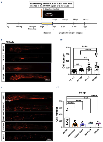 KJ-Pyr-9, OUL35 and CID44216842 effectively inhibit the oncogenicity of human E2A-PBX1-associated pre-B-lineage acute lymphoblastic leukemia. (A) Schematic representation of xenograft development using human B-lineage acute lymphoblastic leukemia (B-ALL) E2A-PBX1(+) RCH-ACV cells in zebrafish larvae. Briefly, embryos were injected with 600 fluorescently labeled RCH-ACV cells into the posterior cardinal vein (PCV) or dorsal aorta (DA) at 3 days post-fertilization (dpf), followed by treatment with small molecules at 24 hours post-injection (hpi). The pre-B ALL cells injected in runx1w84x embryos were monitored by imaging at 12 hpi, 24 hpi, 72 hpi and 96 hpi. (B) RCH-ACV cells were calculated after xenografting into runx1w84x zebrafish at 12 hpi, 24 hpi, 72 hpi and 96 hpi. (B’) Statistical analysis of the RCH-ACV cell number after injecting in panel (B). The black asterisks indicate statistical difference (N≥11, one-way ANOVA, mean ± standard error of the mean; **P<0.01, ****P<0.0001). (C) RCH-ACV cells were calculated after xenografting into runx1w84x zebrafish, followed by treatment with dimethyl sulfoxide (DMSO), 6.17 mM Ara-C (cytarabine), 8 μM KJ-Pyr-9, 20 μM CID44216842 and 24 μM OUL35 at 96 hpi. (C’) Statistical analysis of the RCH-ACV cell number with drug treatment after injecting in panel (C). The black asterisks indicate statistical difference (N≥10, one-way ANOVA, mean ± standard error of the mean; ***P<0.001, ****P<0.0001). |