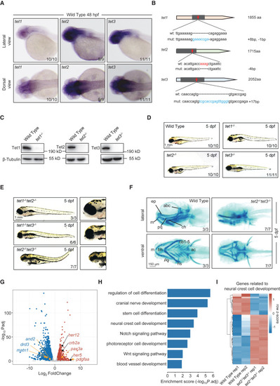 Loss of Tet2 and Tet3 cause defects in craniofacial cartilage development (A) In situ hybridization assay showing tet1, tet2, and tet3 transcripts in wild-type embryos at 48 hpf. Upper, lateral views, anterior toward the left. Lower, dorsal views, anterior toward the left. (B) Generation of tet1, tet2, and tet3 mutant zebrafish. The red arrow indicates the target region of CRISPR-Cas9 gene editing. The nucleotide sequences of wild-type and frameshift mutations are shown. (C) Western blot showing the abundance of Tet proteins in adult brains from wild-type and mutant zebrafish. The molecular weight is shown. β-Tubulin is used as a loading control. (D) Gross morphology of the whole bodies of wild-type and tet1, tet2, or tet3 single mutant at 5 dpf. Lateral views, anterior toward the left. Scale bars, as indicated. (E) Gross morphology of tet1/2, tet1/3, or tet2/3 double mutants at 5 dpf. Lateral views, anterior toward the left. Scale bars, as indicated. (F) Alcian blue staining showing the morphology of pharyngeal cartilage in wild-type and tet2/3 double mutants at 5 dpf. Upper, lateral views, anterior toward the left. Lower, ventral views, anterior toward the left. bh, basihyal; cb, ceratobranchial; ep, ethmoid plate; ac, auditory capsule; abc, anterior basicranial commissure; ch, ceratohyal; hs, hyosymplectic; m, Meckel’s cartilage; pq, palatoquadrate. Scale bars, as indicated. (G) Volcano plots showing gene expression in wild-type and tet2/3 double-knockout (DKO) embryos at 48 hpf. Some DEGs with important physiological functions are highlighted. The cutoff of log2 fold change threshold is ±1. (H) Bar plot showing the Gene Ontology (GO) enrichment items of DEGs. (I) Heatmap showing the expression of selected functional genes in wild-type and tet2/3-DKO embryos at 48 hpf. Each biological replicate for different samples is shown. Expression is shown in blue and red; intensity is proportional to the normalized expression levels. See also Figure S1.  |