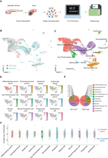 Single-cell transcriptomic atlases of heads from wild-type and tet2/3-DKO embryos at 48 hpf (A) Schematic of the experimental protocol for scRNA-seq analysis. Tissues were dissected from zebrafish embryos at 48 hpf and then enzymatically dissociated into single-cell suspensions. The scRNA-seq libraries were constructed and subjected to high-throughput sequencing. (B) Uniform manifold approximation and projection (UMAP) projection showing cell clustering in wild-type (orange) and tet2/3-DKO (turquoise) samples. (C) UMAP projection showing the annotation of cell clusters with different colors. (D) Feature plots showing the expression of canonical cell markers for each cell type. (E) Pie chart showing the proportions and color codes for each cell type in heads from wild-type and tet2/3-DKO embryos at 48 hpf. (F) Scatterplot showing the DEGs for each cell type. Each dot corresponds to a gene. Gray, not significant. Color coded according to cell type, significant (p<0.00001) DEGs. See also Figures S2 and S3.  |