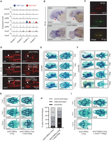 TET2/3 regulate pharyngeal cartilage development by controlling BMP signaling (A) Violin plots showing the expression of typical BMP ligands in EMC sub-clusters between wild-type (blue) and tet2/3-DKO (red) samples. (B) In situ hybridization assay showing bmp4 transcripts in embryos injected with CMO and tet2/3 DMOs at 48 hpf. Upper, lateral views, anterior toward the left. Lower, dorsal views, anterior toward the left. (C) Overlapping of col2a1a mRNA (red) and p-Smad1 (green) signals in zebrafish embryos at 48 hpf. Scale bars, as indicated. (D) Overexpression of wild-type tet2/3, but not mutant form, can restore the level of pSmad1 in tet2/3 morphants at36 hpf. Arrows indicate pSmad1 signals. Scale bars, as indicated. (E and F) Knockdown of bmp4 (F) induces defective cartilage phenotypes in a dose-dependent manner, compared to controls (E). Left panel, lateral views, anterior toward the left. Right panel, ventral views, anterior toward the left. Scale bars, as indicated. (G) Alcian blue staining showing overexpression of bmp4 suppressed the defective phenotype in tet2/3 morphants. Left panel, lateral views, anterior toward the left. Right panel, ventral views, anterior toward the left. Scale bar, as indicated. (H) The extent of defective cartilage phenotypes is divided into three groups. The ratio of each group is shown. (I) Alcian blue staining showing overexpression of smad1CA can suppress the defective phenotype in tet2/3 morphants. Left panel, lateral views, anterior toward the left. Right panel, ventral views, anterior toward the left. Scale bars, as indicated. See also Figures S5 and S6.  |