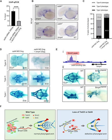 Sall4 regulates bmp4 expression to control pharyngeal arch development (A) Chromatin immunoprecipitation (ChIP)-qPCR analysis of Sall4 binding to the bmp4 promoter in wild-type and tet2/3 morphants at 48 hpf. Statistical variance is examined by the two-tailed Student’s t test. Error bars indicate mean ± SD (n = 3). ∗∗∗∗p < 0.0001. (B) In situ hybridization assay showing the loss of sall4 causes a reduction of bmp4 transcripts in the mandibular region. (C) The bar plot showing the extent of defect cartilage phenotypes is divided into three groups. The ratio of each group is shown. (D) Alcian blue staining assays showing overexpression of bmp4 can partially rescue the pharyngeal cartilage phenotype caused by loss of sall4 at 5 dpf. Scale bars, as indicated. (E) (i) Schematic showing a 5hmC peak and the deletion of Sall4-binding sites on the bmp4 promoter. (ii) Alcian blue staining showing deletion of Sall4-binding sites on the bmp4 promoter causes defective cartilage phenotypes in embryos at 5 dpf. Upper, ventral view. Lower, lateral view. WT, wild type. Scale bars, as indicated. (F) Model of Tet2/3 and Sall4 action on the bmp4 promoter.  |