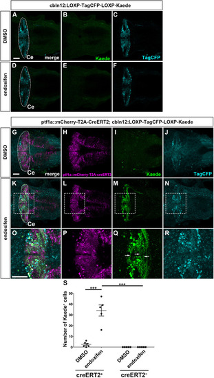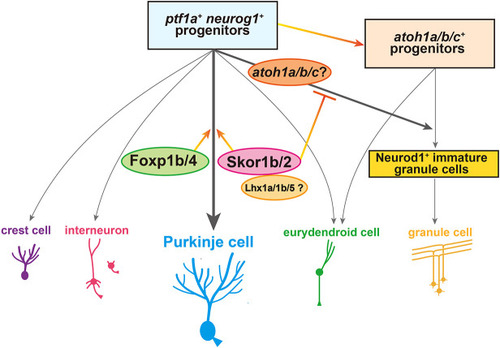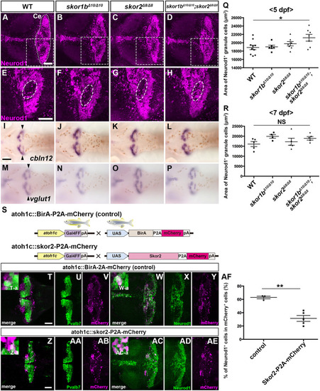 Suppression of granule cell fates by Skor1b/2 and Foxp1b/4. (A-H) Expression of Neurod1 in 5 dpf WT, skor1b, skor2 and skor1b;skor2 mutant larvae, revealed by immunostaining. The cerebellum region is surrounded by a dotted line. (E-H) Higher magnification views of the boxed areas in A-D. Neurod1-expressing GCs were absent in the central areas of the cerebellum (marked by dashed circles) of WT, skor1b and skor2 mutant larvae, but present in the entire cerebellum of skor1b;skor2 mutant larvae. (I-P) Expression of the mature GC marker genes cbln12 and vglut1 in the cerebellum, revealed by in situ hybridization. (Q,R) Area of Neurod1+ GCs in the cerebellum of 5 dpf (Q) or 7 dpf (R) WT, skor1b, skor2 and skor1b;skor2 mutants. *P<0.05 (ANOVA with Tukey's multiple comparison test). (S) Diagram of ectopic expression of biotin ligase A (BirA, control) or Skor2 in GC progenitors. (T-AE) Misexpression of Skor2 in atoh1c-expressing neural progenitors. 5 dpf Tg(atoh1c:Gal4FF);Tg(UAS-hsp70l:BirA-P2A-mCherry) or Tg(atoh1c:Gal4FF);Tg(UAS:HA-skor2-P2A-mCherry) larvae, which express BirA/mCherry or Skor2/mCherry in the GC lineage, were immunostained with anti-RFP/mCherry (magenta), and Pvalb7 (green; T-V,Z-AB) or Neurod1 (green; W-Y,AC-AE) antibodies. Dorsal views with anterior to the left (A-P,T-AE). Insets (T-a,W-a,Z-a,AC-a) show higher magnification views of the boxed areas in T,W,Z,AC. Scale bars: 50 μm (in A, for A-D; in E, for E-H; in T, for T-Y; in Z for Z-AE); 100 μm (in I, for I-P). (AF) Percentage of Neurod1+ cells out of total mCherry+ cells in the cerebellum of larvae expressing BirA (control) or Skor2. **P<0.01 (unpaired two-tailed Student's t-test). Data are shown as mean±s.e.m. with individual values indicated (Q,R,AF).