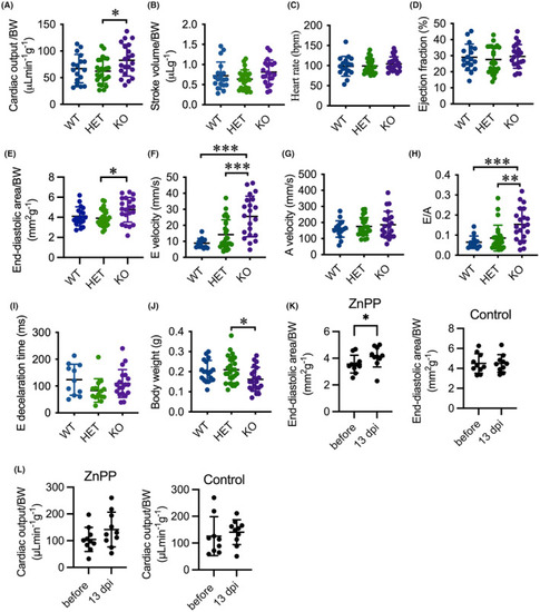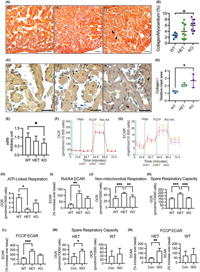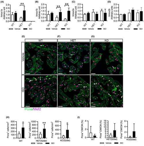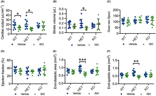 ISO deteriorates cardiac function in HET(52del) adults. (A) ISO treatment results in reduced cardiac output in WT and HET(52del), but not in KO(52del), compared to vehicle‐treated controls. (B) ISO treatment leads to reduced stroke volume in HET(52del), not in WT and KO(52del) compared to vehicle‐treated controls. (C, D) ISO treatment has no significant effect on heart rate (C) or ejection fraction (D) in the three genotypic groups compared to respective vehicle controls. (E, F) ISO treatment leads to reduced end‐diastolic (E) and end‐systolic area (F) in HET(52del), not in WT and KO(52del) compared to vehicle‐treated controls. WT, vehicle |