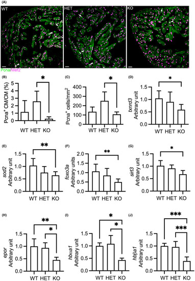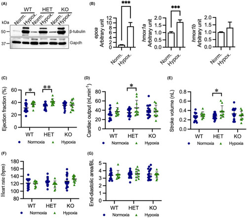 Hypoxia enhances cardiac output in HET(52del) larvae. (A) Representative immunoblots of β‐tubulin and Gapdh in WT, HET(52del), and KO(52del) at normoxic and hypoxic (3% O2 for 24 h) conditions. Gapdh serves as an internal control. Norm. normoxia; Hypox. Hypoxia. (B) RT‐qPCR analyses indicate that hypoxia induces upregulation of |