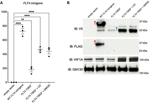 Hypoxia mimetics regulate the stability of an FLT4/ FLT4-TOF-PTV. RNA (A) or protein (B) was prepared from primary human ECs (HUVECs) expressing the FLT4 minigene assay construct (as outlined in Supplementary material online, Figure S4). EV, WT, or Q736* PTV FLT4 minigenes were untreated, or treated with the hypoxia mimetics, 0.2 mM cobalt chloride (CC) or 100 nM DMOG, for 3 h. Red dagger, full-length minigene protein, both V5 and FLAG positive; blue dagger, truncated minigene protein caused by the introduction of a nonsense codon and concomitant C-terminal cleavage, V5 positive only; n = 3; **P < 0.01; ****P < 0.0001. |