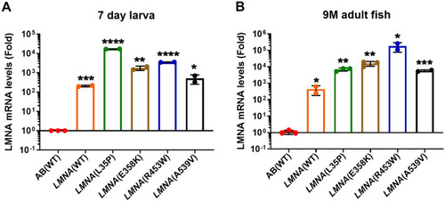 Swim speed analysis of F1 adult zebrafish expressing mutant human lamin A/C with those expressing WT human lamin A/C. ( PHENOTYPE: