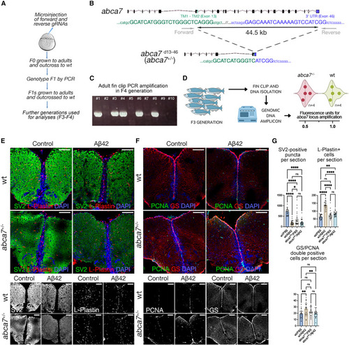 abca7 is required for synaptic integrity, microglial prevalence, and astroglial proliferation in zebrafish (A) Schematic view of generating abca7 knockout line. (B) 44.5-kb deletion in abca7 gene. (C) Representative genotyping PCR gel from F4 generation where positive bands indicate the deletion. Every column is one adult fin-clip DNA sample amplified with the forward and reverse primers in (B). (D) Genotyping results with genomic DNA qPCR in F3 adults. Eight animals (four wild-type and four heterozygous deletions) were used. Heterozygous deletions show reduced amplification (lower fluorescence). Results depicted as violin plots and individual values. (E) Immunofluorescence (IF) for SV2 (green) and L-plastin (red) with DAPI counterstain in wild type and abca7+/− with and without Aβ42. Black and white panels indicate individual fluorescent channels. (F) IF for PCNA (green) and GS (red) with DAPI counterstain in wild type and abca7+/− with and without Aβ42. Black and white panels indicate individual fluorescent channels. (G) Quantification of SV2-positive synaptic puncta, number of microglial cells, and number of proliferating astroglia. One-way ANOVA with Tukey’s multiple comparison test was used for statistical analyses. n = 4 animals from both sexes with 24 brain sections per group. ∗p < 0.0332, ∗∗p < 0.0021, ∗∗∗p < 0.0002, ∗∗∗∗p < 0.0001; not significant (ns), p > 0.0332. Scale bars, 100 μm. See also Figures S1 and S4 , Data S1 , and Table S1 . |